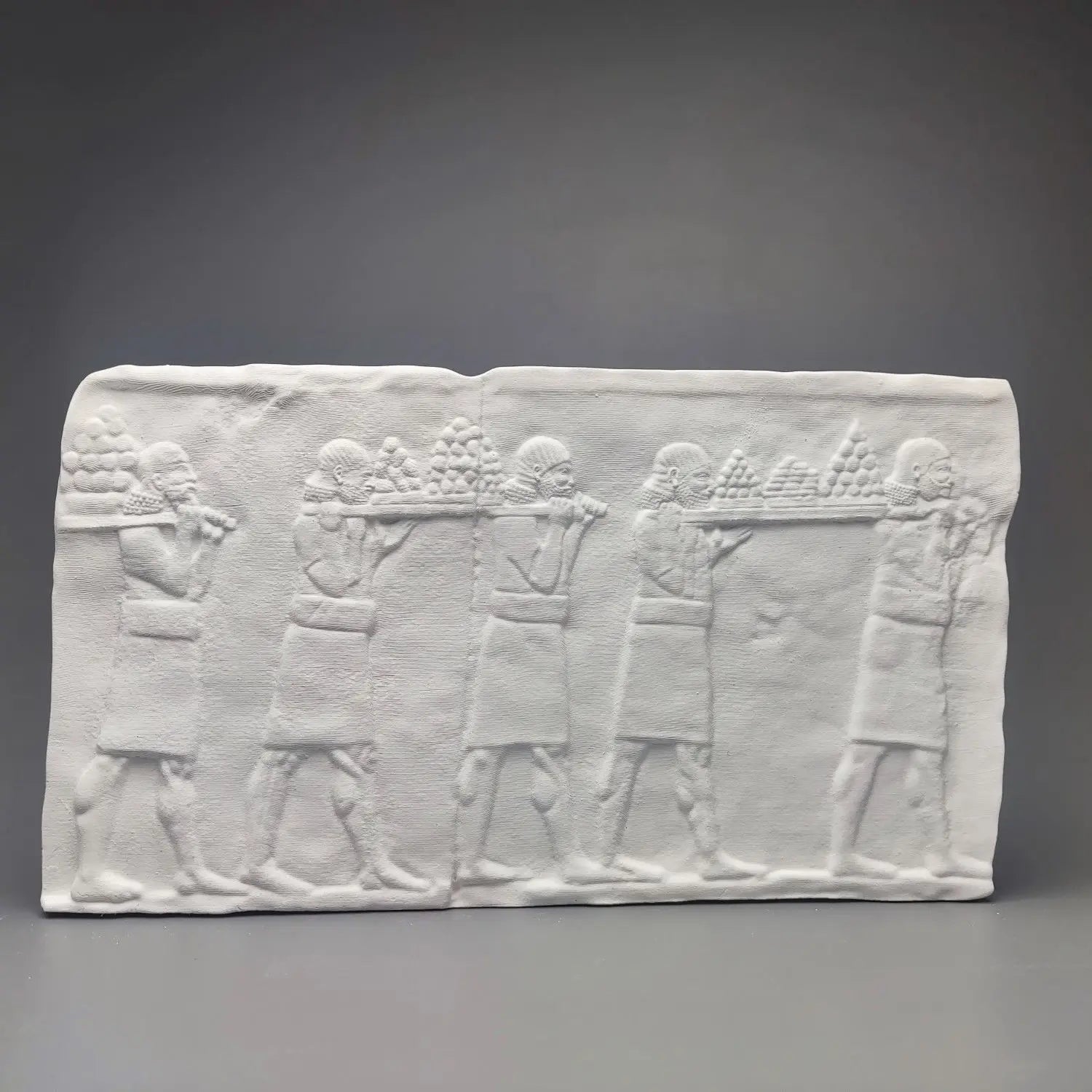 This plaster relief depicts a procession of figures carrying offerings, inspired by the grand palace wall carvings of ancient Assyria. Such scenes once adorned royal palaces in Mesopotamia, illustrating feasts, banquets, and tributes to the king.
