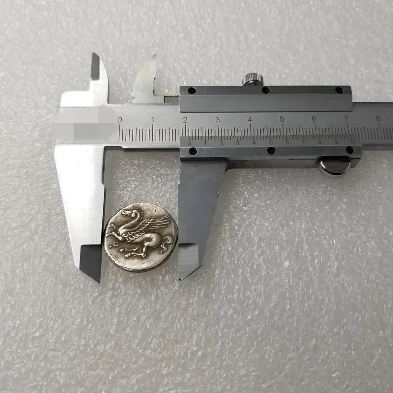 This replica coin reproduces a silver stater from Corinth, struck between 350–285 BCE. Corinth was one of the wealthiest and most powerful Greek city-states, famed for its naval might, trade networks, and artistic influence. Its Pegasus staters became some of the most widely recognized and circulated coins in the ancient Greek world.